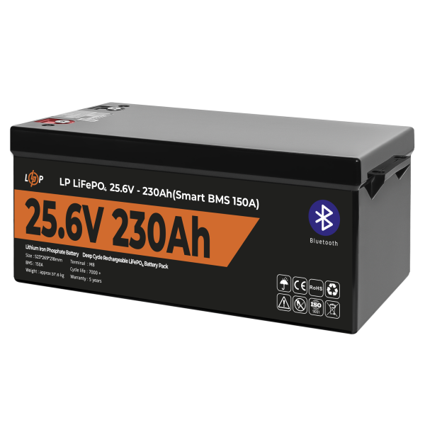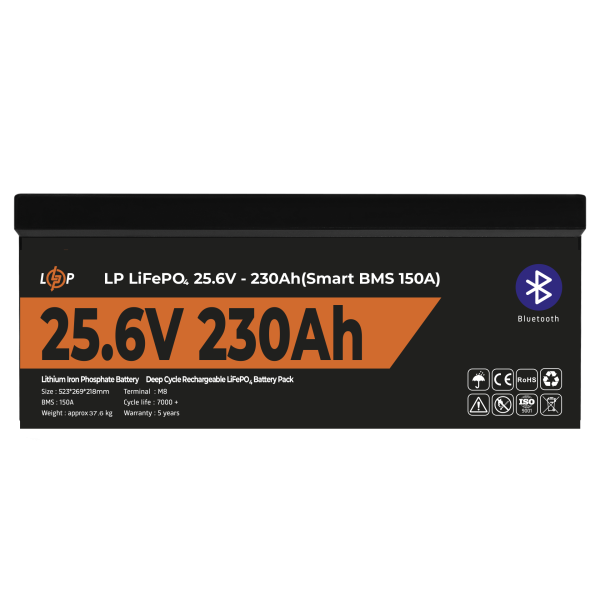 Забудьте про блекаути з літій-залізо-фосфатними (LiFePO4) акумулятором Акумулятор підходить для роботи з ДБЖ Акумулятор LP LiFePO4 25,6V - 230 Ah (5888Wh) (Smart BMS 150А) з BT пластик Максимум енергії для комфортного життя Час до повного заряду батареї від 2 годин. Більше ніж 5 годин автономного живлення для вашої техніки. 15 років ефективного використання. *Час заряду може змінюватись в залежності від струму заряду. Літієві батареї LiFePO4 українського бренду LogicPower забезпечують надійну та безпечну роботу для систем резервного живлення різної потужності. Кожна модель наших акумуляторів оснащена передовою системою управління батареями (BMS). Це гарантує максимальну ефективність, довговічність і безпеку в експлуатації. Переваги літієвого акумулятора LiFePO4 Швидке заряджання та відсутність ефекту пам'яті: Літієві акумулятори заряджаються значно швидше, ніж свинцево-кислотні. Відсутність ефекту пам'яті означає, що акумулятор можна заряджати та розряджати за будь-якого рівня зарядки без втрати ємності. Акумулятори LiFePO4 заряджаються з максимально рекомендованим струмом 0,5С, де С - ємність акумулятора. Для акумулятора LP LiFePO4 25,6V - 230 Ah максимальний струм заряду не повинен перевищувати 115 А (0,5 x 230 Ач). Важливо, щоб цей струм не перевищував BMS, щоб зберегти безпеку та продовжити термін служби акумулятора. Довговічність: АКБ LiFePO4 мають величезний термін служби. Вони здатні витримати до 7000 циклів розрядки й зарядки, що в рази перевищує термін служби свинцево-кислотних акумуляторів. Наприклад, літієвий акумулятор для ДБЖ (UPS) ефективно працюватиме понад 10 років. Безпека та екологічність: Технологія виготовлення літій-залізо-фосфату забезпечує високу стабільність і безпеку акумулятора. Термічна та хімічна стабільність - ключова особливість LiFePO4. Даний тип акумуляторів має значну перевагу в частині безпеки порівняно з іншими типами літієвих батарей. Вбудована система управління батареєю (BMS) захищає від перезаряду, перерозряду, перегріву та короткого замикання. Наприклад, використання таких акумуляторів у домашніх системах резервного живлення мінімізує ризик виникнення пожеж. Літієвий акумулятор для котла має низьку токсичність, що робить їхнє використання та утилізацію безпечною для довкілля. Компактні розміри: Літієві акумулятори легші та компактніші за свинцево-кислотні. Це спрощує їх транспортування та встановлення. Низький рівень саморозряду: Літієві акумулятори LiFePO4 мають низький рівень саморозряду, що дає змогу зберігати заряд під час простоїв без необхідності підзарядки. Енергоефективність: Висока щільність енергії дає змогу літієвій батареї зберігати більше енергії в меншому об'ємі, порівнюючи зі свинцево-кислотними акумуляторами. Де використовують літієвий (LiFePO4) акумулятор 25,6В в Україні? Резервне живлення для дому та квартири У разі відключення електроенергії, літієві акумулятори LiFePO4, можуть підтримувати роботу побутових приладів: Освітлення: Основне або аварійне освітлення в будинку. Побутова електроніка: Телевізори, холодильники, комп`ютери, роутери. Портативні зарядні станції: Для заряджання мобільних телефонів, ноутбуків та інших пристроїв. Системи резервного живлення Літієві акумулятори LiFePO4 широко використовуються в системах резервного живлення для критично важливого обладнання: Забезпечують безперебійне живлення серверів і мереж